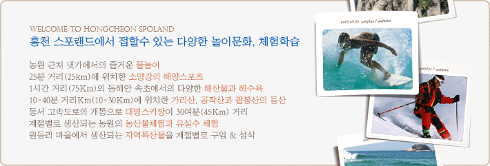 ¶ÇÇÑ, À̰÷ ÁÖº¯ °¿øµµÀÇ ¾Æ¸§´Ù¿î ÀÚ¿¬¼Ó¿¡¼ÀÇ ´Ù¾çÇÑ ³îÀÌ ¹®È¸¦ Á¢ÇÒ ¼ö ÀÖ´Â ´Ù¾çÇÑ Ã¼Çè°ú ÇнÀÀ» ÁغñÇϰí ÀÖ½À´Ï´Ù.